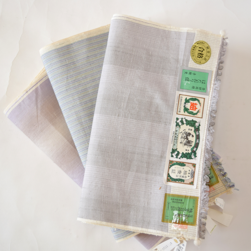 うすいグレーの地色に絣のしまでできております3点とも柄は違いますが薄地の絣の縞です。